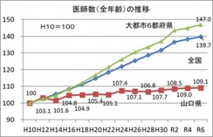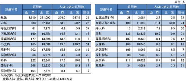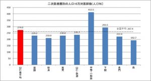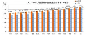 また、人口10万人当たりの医師数は274.0人で、全国平均(267.4人)を上回り、中位レベルにあります。