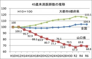 本県の医師総数は全国と同様増加していますが、その増加率は全国平均を下回るとともに、35歳未満、45歳未満の医師の減少が顕著であり、近年は増加傾向にあるものの、引き続き若手医師の確保が喫緊の課題です。