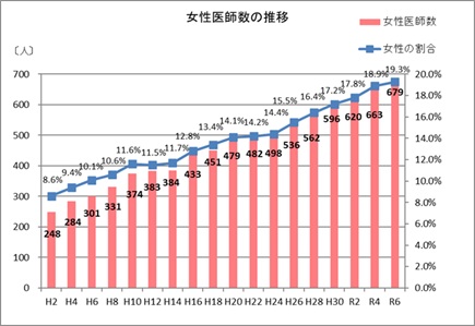 本県の女性医師の割合は年々増加しており、仕事と家庭の両立ができる就業環境整備の重要性が増しています。